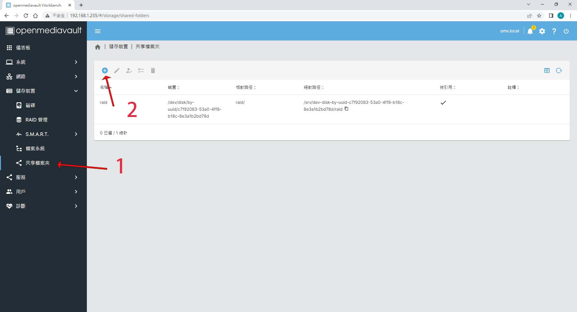圖中已經存在一個 "共享資料夾"- 名字 "raid",是筆者之前建立的。